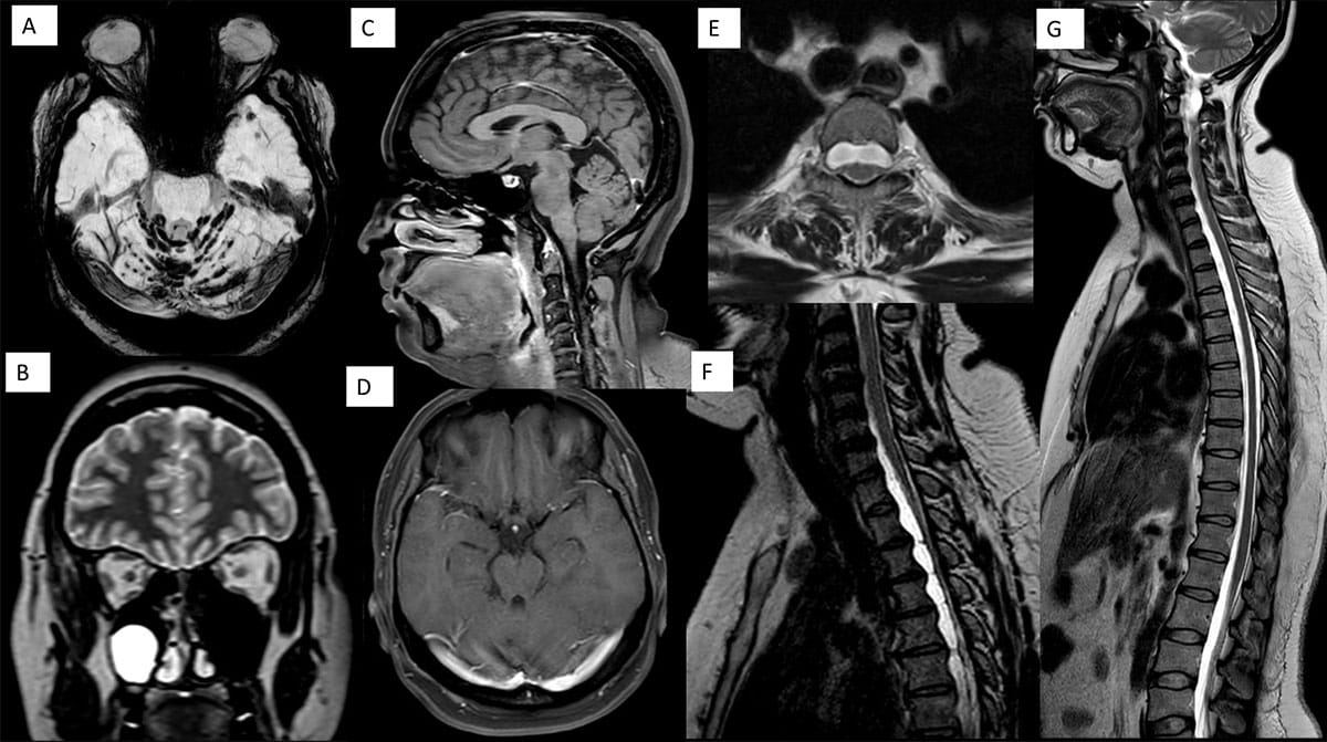 An 11-year-old female presented with complaints of progressive weakness of the left upper and lower limbs for 1 year, dysphagia for 4 months, reduced vision in the left eye for 3 months, dysarthria for 2 months, and urinary incontinence for 15 days.