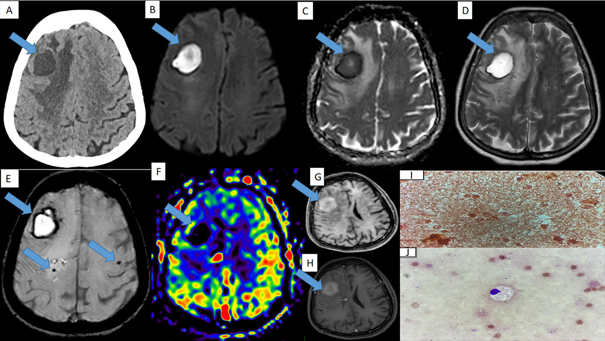 - E: Axial section of susceptibility weighted sequence shows peripheral blooming around the lesion with few microbleeds adjacent to the lesion.