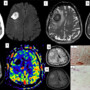 - F: Axial section of arterial spin labelling sequence shows no perfusion at the centre and periphery.